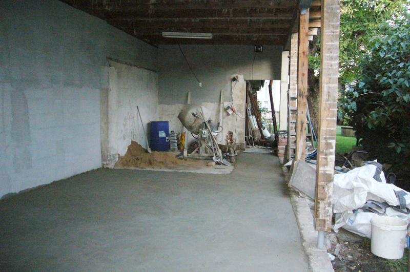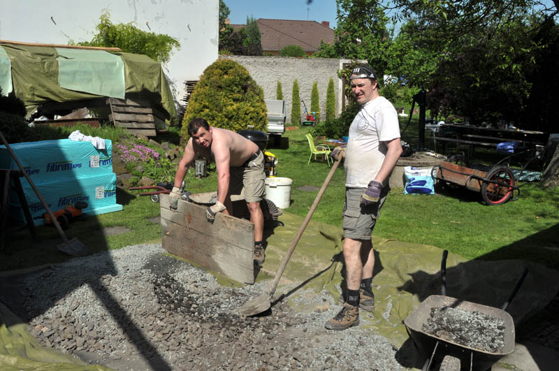 Než se koplo do země, ještě hodně vody uteklo...o víkendu se sjeli kamarádi, aby Macibobovi pomohli se stavbou, resp. založením truhlárničky. Nakonec se stihlo mnohé, tj. za víkend naplnit a hlavně vykopat a odvozit 3 kontajnery hlíny, dále se přemístily 2 avie písku a štěrku z hromady pod ořechem postupně přes míchačku do výkopu, který se tedy téměř dle plánu napnil betonem míchaným hned v centru všeho dění. Trochu suchopárných, leč zajímavých údajů: počet odpracovaných hodin -12h, nedělní - 8h, půdorysné rozměry cca 11 x 4,5m (částečně se využije zdí původní kolny), objem vykopané zeminy byl 7,2 m3 - hmotnost cca 14t, celkový objem postupně přemísťovaných štěrkopísků cca 4,25 m3(cca 7,65t), hmotnost palety postupně převozeného cementu 1,4t, objem pasů 4,65 m3, hmotnost beton. pasů cca 10,5t (včetně různé výplně:))...a to vše se dělo za pomoci max 5 párů silých paží a jedné silné míchačky o objemu 150L