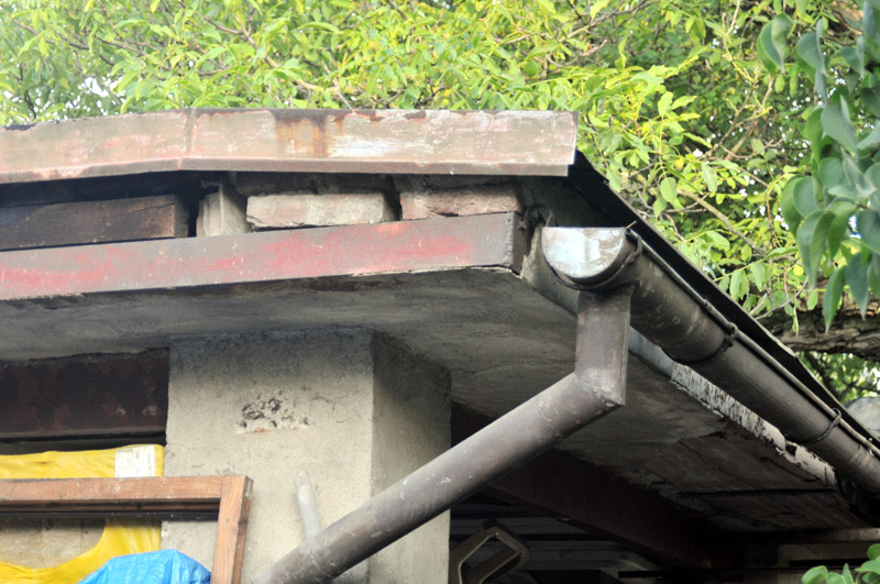 Aneb jak se bourala střecha nad kolnou. Postavili jsme zatím provizorní zastřešení, aby se dalo pokračovat. V souladu s lidovou hláškou, že sud na stojato a ženská naležato unesou vše, jsem na stranu garáže dal sud, na který se provizorně položil trám vynášející prozatimní zastřešení. Soused se zděsil, co se to jako cirkusové šapitó zvedá k nebi...Další díl seriálu bude následovat snad v říjnu. (fota jsou převzatá, díky Budka) Nosnou konstrukci původní střechy kolny z válcovaných profilů jsme si nechali jako lešení. Kdybych předem tušil, jak se bude špatně řezat, snad bych to rozřezal hned. Kdoví, odkud se v roce cca 1978 vzala ta ocel, úplně obyčejna 235-tka to snad ani být nebyla, na to byla moc pevná, karborunďáky na 230-tkové rozbrušovačce se po lehkém zahřátí začly kroutit jak had, maličko jsem se obával, že se roztrhnou a něco si provedu, jak je občas mým dobrým zvykem. Naštěstí ale byl po ruce kamarád, který měl doma pálící nástavec na autogen, já měl zrovna plné lahve doma, takže nakonec jsme tu ocel rozřezali pěkně klasicky, autogenem. A bylo to za pár minut hotové. Předtím jsem to jedno L-ko řezal dobrých 20min a ještě jsem musel použít kotouč na nerez, tím to relativně šlo.