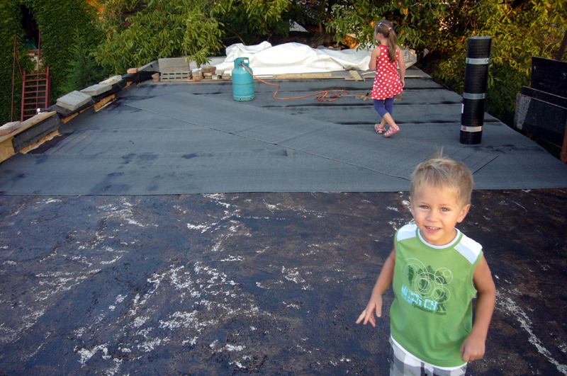 V noci, poslední srpnový a horký den, jsem položil dalších pár metrů asf. pásů, ty budou sloužit dočasně jako krytina, ale po nalepení kašírovaných polystyrenových dílců už budou jen jako parozábrana. První školkový den jsem to fotil a děti chtěly nahoru také, tak doufám, že se neopomněly hned ve školce chlubit, že je táta vzal na střechu...