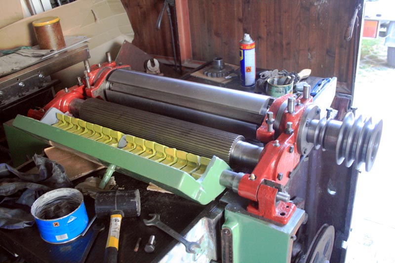 2012-01-29 Tak jsem zkompletoval soubor podávacího válce, chybí mi dva červíky M8, někam zalezli asi... Také to vypadá, že jsem prohodil lůžka, montovaná na tělo stroje, bo jaksi nesedí osově. /samozřejmě - označené jsem to neměl.../ To se musí pořešit ještě, i se svařením prasklého jednoho kousku, ale to abych si pozval zase silnou ruku k tomu, nandat mi to šlo sice těžko, ale dal jsem to. Ovšem zvednout to teď jako celek z lůžek je skoro nemožné, i vzhledem k tomu, že s, opět funkčními, ložisky je to jak živé