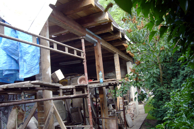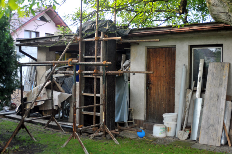 Asi pár slov úvodem(01/2015): protože podmínky za kterých provozuji drobného koníčka, práci se dřevem a vše kolem, se staly již neúnosnými, rozhodl jsem se pro výstavbu menší dílny. Tu jsem plánoval dlouho, předlouho a také i její stavba bude předlouhá. Ani jsem v té době moc neměl tušení, že o pár měsíců pozděj, jaksi zcela neplánovaně vyplním přihlášku na VŠ a po téměř 20 letech od maturity se mi povede návrat na ČVUT (z které jsem kdysi seběhl). O umístění jsem zas tak dlouze přemýšlet nemusel, na pozemku, mimo plochu určenou jako zahrada, zbýval ještě kus volného místa po pradávno zbořených kurnících s postupně odumírající, přibližně 80-tiletou švestkou. Aby to nebylo z bláta do louže - garáž, které mám umístěno oněch inkriminovaných pár tun strojů, má cca 25m2, usoudil jsem, že bude vhodné pro plánovanou dílnu taktéž využít stávající kolnu, která beztak sloužila jen jako sklad bordelu. Po sáhodlouhém procesu na SÚ jsem dosáhl svého a úřední povolení bylo, tuším, na sklonku r.2012 vydáno. Od té doby probíhá postupná výstavba, jak prostředky (setrvalý nedostatek) a volný čas (kamarádů a můj) dovolí.