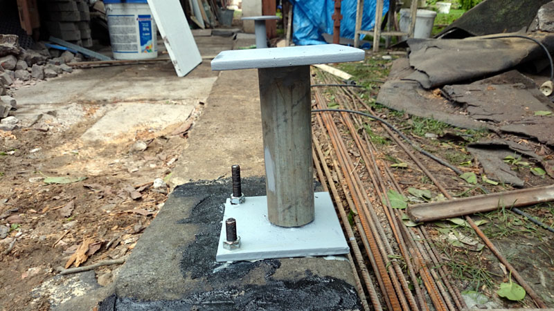 Pokračování po odmlce, způsobené dlouhotrvajícím zkouškovým obdobím. Nebyl čas, ptát se, kdo je kdo...Tedy dva sloupy, poslední, jsou umístěny, zatímco poslední dvě zkoušky mě ve škole ještě čekají, vaznice prodloužena na předposlední sloupek, kde bude končit, ocelová spojka natřena. Zakryli jsme provizorně. Na další víkend jsou domluveni kamarádi, bude se tvořit takový drobnější ocelový svařenec, výměna pro uložení dvou mezilehlých stropnic, které nemohou být podepřeny vaznicí. Také doufám dojde na položení bednících desek. Za konzultaci ohledně koncepce uložení stropnic na svařenec tedy zde děkuji jednomu z mých cvičících na ČVUT. Jen mám obavu, že jsem si to zas upravil k obrazu svému a hlavně dostupnému materiálu, haha