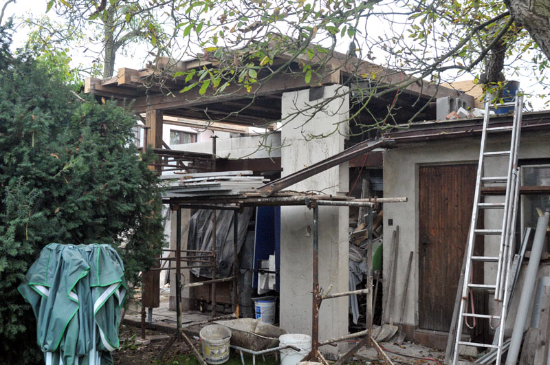 Aneb jak se bourala střecha nad kolnou. Postavili jsme zatím provizorní zastřešení, aby se dalo pokračovat. V souladu s lidovou hláškou, že sud na stojato a ženská naležato unesou vše, jsem na stranu garáže dal sud, na který se provizorně položil trám vynášející prozatimní zastřešení. Soused se zděsil, co se to jako cirkusové šapitó zvedá k nebi...Další díl seriálu bude následovat snad v říjnu. (fota jsou převzatá, díky Budka) Nosnou konstrukci původní střechy kolny z válcovaných profilů jsme si nechali jako lešení. Kdybych předem tušil, jak se bude špatně řezat, snad bych to rozřezal hned. Kdoví, odkud se v roce cca 1978 vzala ta ocel, úplně obyčejna 235-tka to snad ani být nebyla, na to byla moc pevná, karborunďáky na 230-tkové rozbrušovačce se po lehkém zahřátí začly kroutit jak had, maličko jsem se obával, že se roztrhnou a něco si provedu, jak je občas mým dobrým zvykem. Naštěstí ale byl po ruce kamarád, který měl doma pálící nástavec na autogen, já měl zrovna plné lahve doma, takže nakonec jsme tu ocel rozřezali pěkně klasicky, autogenem. A bylo to za pár minut hotové. Předtím jsem to jedno L-ko řezal dobrých 20min a ještě jsem musel použít kotouč na nerez, tím to relativně šlo.