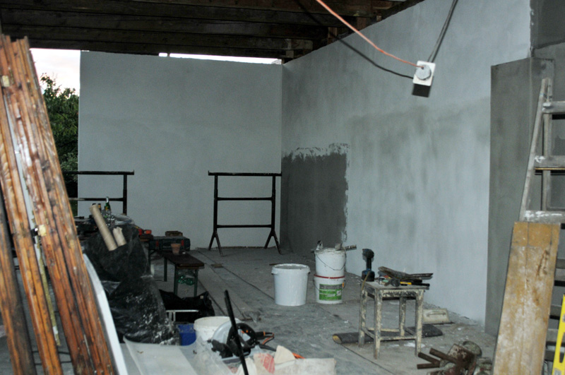 svátek práce jsme slavili prací, jak jinak. Dorazil mistr zednický Čabík, celé tři dny jsme byli zavření v dílně, já dodělával sádrákový podklad, on to natahoval a v pondělí pak celé naštukoval. mezitím jsem stihl ještě dokončit ostění již osazeného okna a připravit profil na uchycení okna budoucího. Jo a taky páně judrovi jsem protáhl jasánkové lišty, abych mu konečně zalištoval podlahové topné registry..