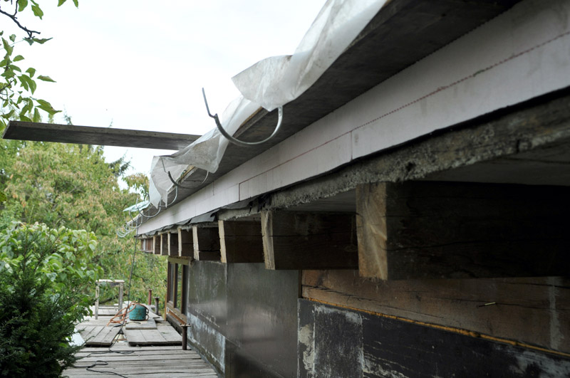 nový podklaďák je už napenetrovaný, jeden 10m pás natavený...osazuji na sloupy úhelníky na montáž severní (dřevěné) stěny