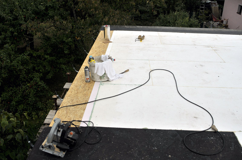 je to neskutečné, jak čas letí, fotky jsem zanedbal, práci na dokončování truhlárny také moc neženu, stále je škola, zaměstnání, anebo jiné věci, které se zdají být duležitější. Nicméně truhlárna je zavřená, dveře jsou ještě provizorní, na východním průčelí jsou zabedněné osb-čkou a na střeše je již nalepeno 200mm EPS polystyrenu. Protože jsem už nesehnal kašírovaný (ten co jsem měl byla náhodná koupě zbytku z haly za pár korun), musel jsem položit obyčejný, čistý polyš, který momentálně polepuji asfaltovými pásy. To samotné ani tak pracné není, ale než jsem provedl celou přípravu k tomu, tj. vytvoření pevných, únosných krajů střechy, byla to téměř věčnost. Do letošní zimy je v plánu kompletní dokončení střešní krytiny s oplechováním. Ještě pak drobné vyzdívky mezi trámy uvnitř, pokrytí dřevěných stěn sádrošem a tím by se ukončily stavební procesy kvůli kterým jsem zatím nechtěl stěhovat stroje.