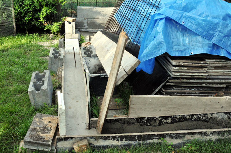 Než se koplo do země, ještě hodně vody uteklo...o víkendu se sjeli kamarádi, aby Macibobovi pomohli se stavbou, resp. založením truhlárničky. Nakonec se stihlo mnohé, tj. za víkend naplnit a hlavně vykopat a odvozit 3 kontajnery hlíny, dále se přemístily 2 avie písku a štěrku z hromady pod ořechem postupně přes míchačku do výkopu, který se tedy téměř dle plánu napnil betonem míchaným hned v centru všeho dění. Trochu suchopárných, leč zajímavých údajů: počet odpracovaných hodin -12h, nedělní - 8h, půdorysné rozměry cca 11 x 4,5m (částečně se využije zdí původní kolny), objem vykopané zeminy byl 7,2 m3 - hmotnost cca 14t, celkový objem postupně přemísťovaných štěrkopísků cca 4,25 m3(cca 7,65t), hmotnost palety postupně převozeného cementu 1,4t, objem pasů 4,65 m3, hmotnost beton. pasů cca 10,5t (včetně různé výplně:))...a to vše se dělo za pomoci max 5 párů silých paží a jedné silné míchačky o objemu 150L